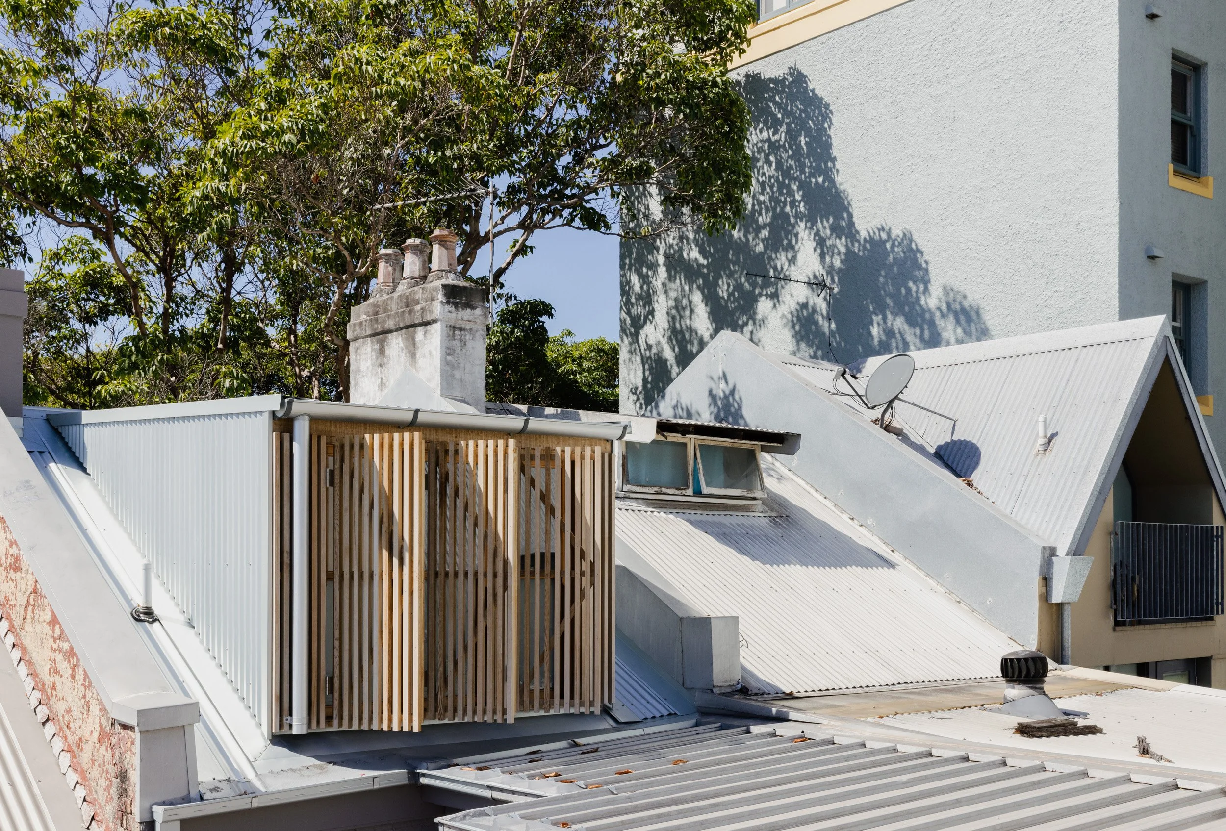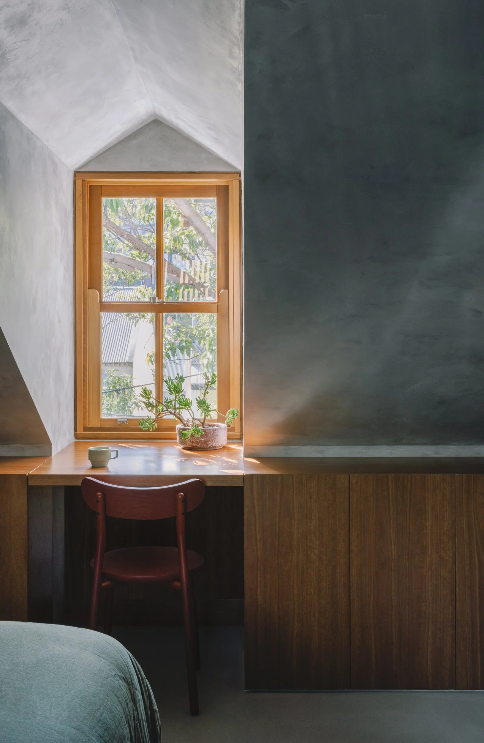 Darlinghurst Terrace reconfigures a small Victorian terrace to provide an additional bedroom and bathroom in the existing roof space. The new spaces provide much needed additional accommodation and have been painstakingly planned around minimum head heights and room sizes. Although compact, the new spaces provide a calm and serene escape from the busy Darlinghurst context.